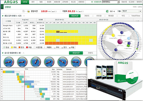 Argos measures the target web site for testing in real time on demand in all parts of the country combined with IE6, IE7, IE8. It shows the data analyzed by each network (DNS, Socket Connect, First Byte, Download)loading whole web site and measuring real user’s sense of speed on the target web site for testing.