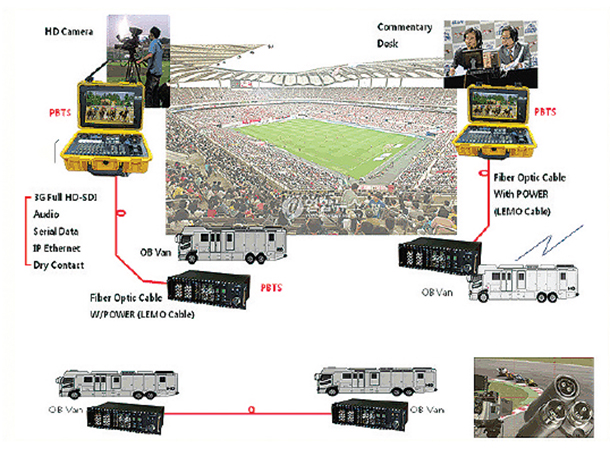 For abroad marketing this year, Oticom arranged its newest portable broadcasting transport system (PBTS) model named PBTS-2300L that converts various signals being handled at an outside broadcasting venue into digital data and transmits it via optical fiber cables.