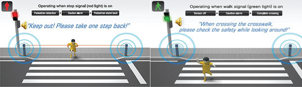 contents like “Confirm safety while looking inthe directions of left and right when crossing a crosswalk, please!” Hanbaek System I-Safe, thus, prevents the occurrence of collision accidents at the crosswalks, between vehicles and pedestrians.