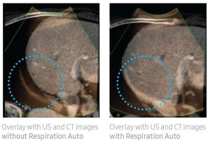 When performing fusion imaging of real-time US and previously recorded CT images, the difference of respiratory phase can cause registration gaps between the images. Samsung’s Respiration Auto feature minimizes these registration differences by generating a CT image of exhalation based on the acquired image of inhalation. This respiration compensation technology makes the registration faster, helping eliminate fusion inaccuracy.
