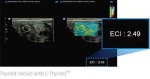 E-Thyroid™ provides an assessment of thyroid lesions by incorporating an index for suspicious areas. E-Thyroid™ images are generated using pulsations from the adjacent Carotid Artery, eliminating the need for manual transducer compression and offering greater consistency.