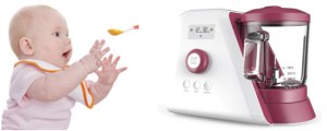 Baby food maker has a one-stop menu button. First-time parents can make very easy, nourishing, and healthy meals only for their baby. Steam cooking minimizes the loss in minerals, vitamins, moisture and gravy. Just fill the water tank and put rice, vegetable, fish, grain, fruit, meat or other ingredients into the glass blending bowl. Next, select the cooking option and press start. You can prepare not only weaning food, but also purees, porridge, rice cake, steamed eggs and various other foods.