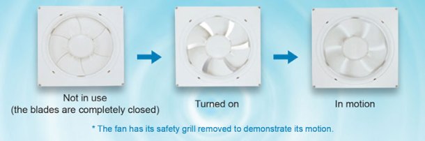 There is no need for additional shutters. In other words, even if the power is off , the blades close automatically with no need for manual control. And they are very simple to operate with these automatic shutters and easy to connect to thermostats, gas detectors, etc. The shutters close completely so that insects and even smell does not penetrate. They are fully manufactured only in Korea as well.