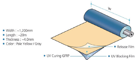 It is produced in roll form of 2 ~ 3m in thick, 1m in wide and 10m in long, and can be cut and used according to each different purpose. It can be cured in about 5 ~ 10 minutes in ordinary sunlight and within 30 seconds using industrial UV lamp.