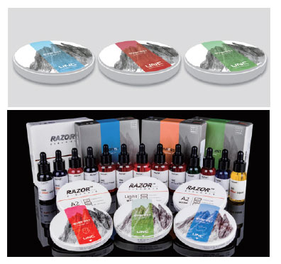 The RAZOR block series have noticeable harmonious merits with colors of teeth that users can use them conveniently for making dental prosthesis in dental clinic and dental technical laboratory.