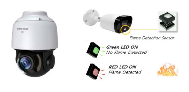 A flame-detection sensor is merged with the conventional camera for fast verification and to quick reaction. Able to detect flame up to 35meters including small size flame, and it has 90° of FOV. It gives red and green signals to indicate the detection of flame, and it is an accurate and low-cost solution compared with other solutions on the market.
