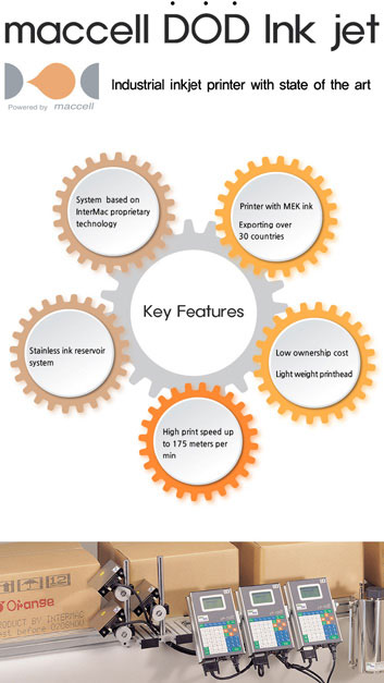 [INQ. NO. 2003E02] The maccell DOD ink-jet printing system has been focused on various applications and is easy to operate. It is designed for impact, and the fine ink jet printer adopts separated design, large graphic LCD and dialogue menu. You can get flexible, fine marking with fast speed of 175 meters per minute. LP7000+ plus inkjet controller, one of maccell’s technologies, can be used in a wide variety of field applications, and is designed to maximize user convenience with little supervision. Multi-language support and interactive menu display, easy message edition, and other functions are perfect choices for many users.