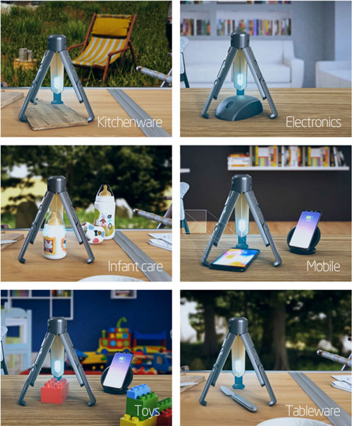 As the product is tripod-shaped, any types of objects placed within the range of the tripod can be sterilized. In addition, it is also possible to widen the sterilization scope by extending the legs of the tripod. Anyone can easily and simply use the sterilizer as it starts working and automatically stops three minutes after the sterilization. All that the user has to do is to place an object within the tripod and press the power button on top for sterilization. In addition, it can be used as a cradle and a camera tripod by attaching the head cap.