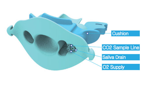 For endoscopy, oxygen supply and respiration monitoring are available. Suction allows the saliva and contaminated air to be released to prevent contamination in the laboratory. No headband and Nasa ltube are needed.