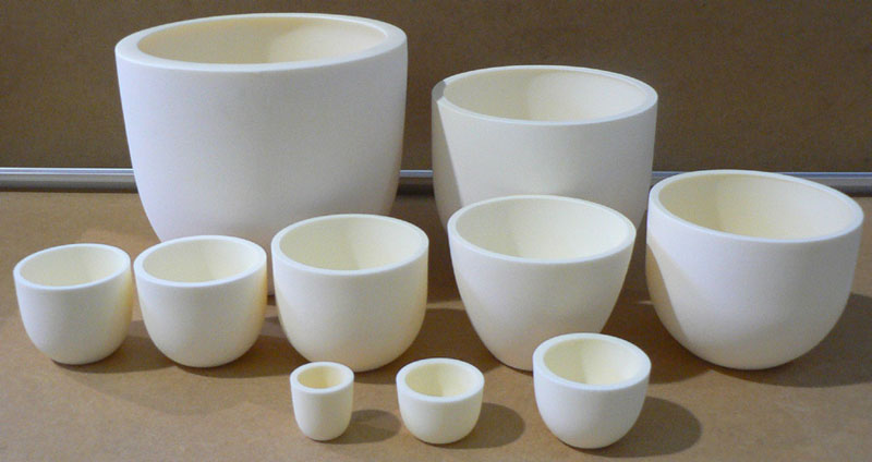 Two types of heat-resistant crucible are available: one is the double layer crucible protecting its contents with excellent thermal-shock resistance for frequent and steady use; and the other is the single layer crucible for inexpensive price. The basic thermal resistance temperature for both types is 1,650˚C, and they are now are being produced in various content capacity or size in accordance with customers’ requests.