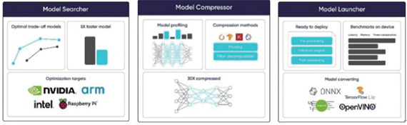 One of the best features of NetsPresso is its modularity. The platform is modularized into three modules: model searcher, model compressor, and model launcher. Model searcher automatically searches optimized models for your target device. Model compressor offers optimal tradeoff between performance and efficiency. Model launcher accelerates models and simplifies deployment.