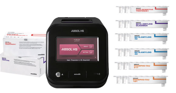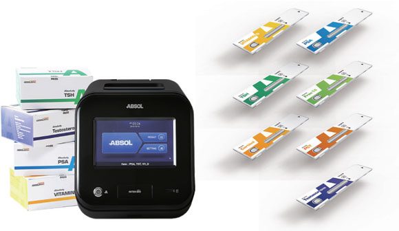 ABSOL and ABSOL VET are automated fluorescent immunoassay (FIA) analyzers. They can be attached to a POCT near a patient-testing device. ABSOL system provides quantitative results from various biomarkers called Absoludy : PSA, Testosterone, Vitamin D, TSH, Free T4, COVID-19 lgM/lgG, COVID-19 Ag, Thyroid Combo, Cortisol, cCortisol, cTSH, cCRP and fSAA.