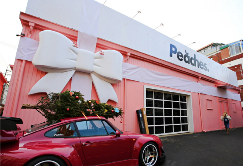 Peaches. D8NE is an offline flagship store launched by Peaches., a lifestyle brand inspired by automobiles. The store uses cars as a theme to create a unique atmosphere both inside and out. Not only does the store sell and showcase products by Peaches., but also has well-known food franchises like Downtowner burger house and Knotted donuts.