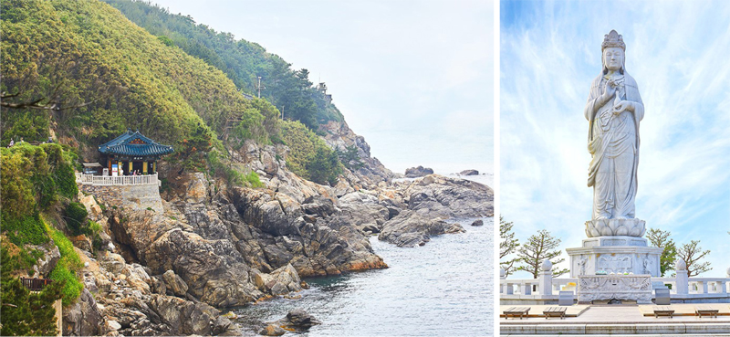 Naksansa Temple is located atop Obongsan Mountain with an unobstructed view of the East Sea. As one of the three main temples in Korea dedicated to the Avalokitesvara Bodhisattva, it is famous for its grand 16-meter-tall Avalokitesvara Bodhisattva statue. They say if you rub the back of the stone frog below the statue, you will be granted a wish.