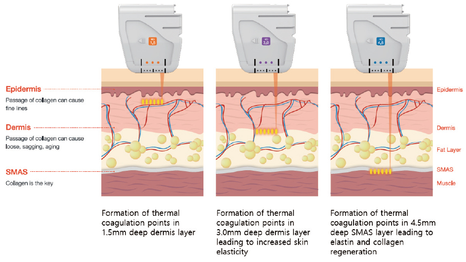 Because ultrasonic-wave energy is transmitted even to the dermal muscular layer (SMAS) without necrosis in surrounding cells, wrinkle improvement is excellent for nasolabial folds and fine wrinkles in the brow, the corners of the eyes, below the eyes, and the jawline − compared to existing laser IR or RF devices.