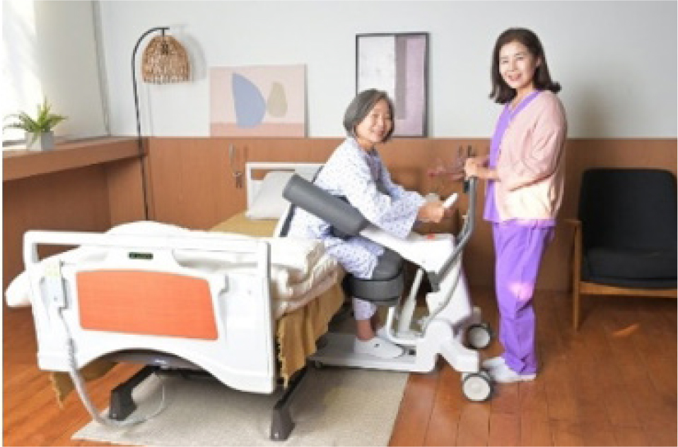 Pebble-i’s mobile care robot UPGO Plus is an assistive device that helps transport patients or the elderly from one location to another. It adopts the principle of a lever that induces a patient or elderly person to straighten their knees to stand, and to sit them down through a knee-folding motion.