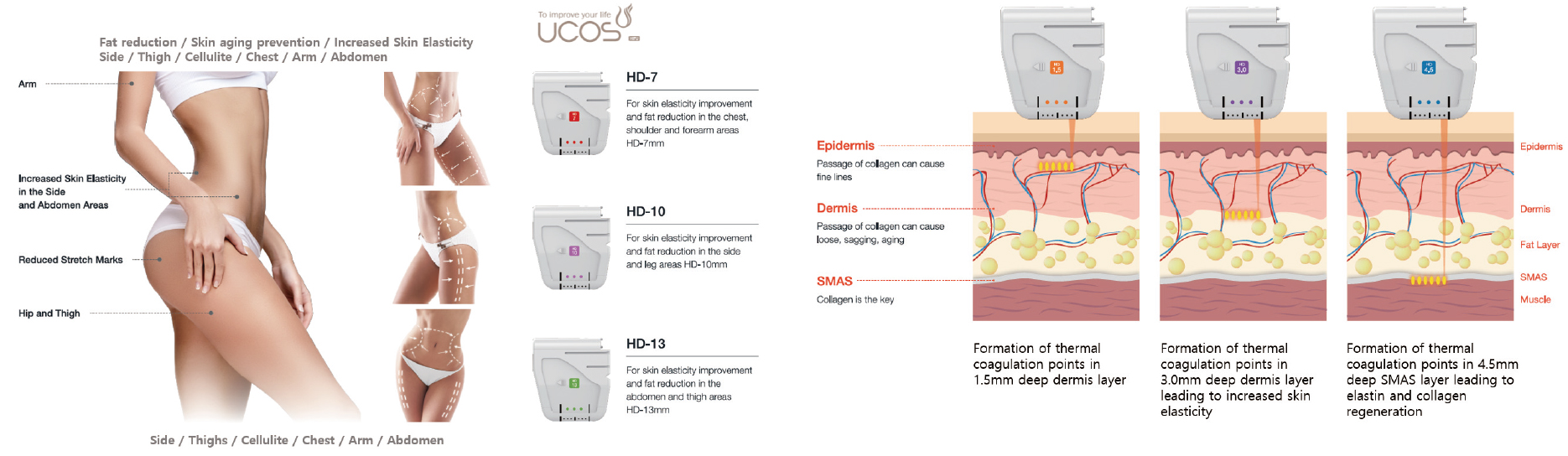 Lifting a part of the body, intensifying skin elasticity, improving skin ageing, and natural maintaining of body shape, can be done through the UCOS-HIFU procedure.