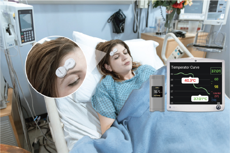 ChoisTechnology’s wireless monitoring deep body clinical thermometer, Thermosafer XST600, can continuously measure core temperature using ‘Heat Flux’ technology. A wearable core thermometer attached to the forehead allows measurement and continuous monitoring through a smart device. It is also possible to sound an alarm according to the set temperature range. When linked to a subscription service, it is also possible to monitor patients from a remote location.