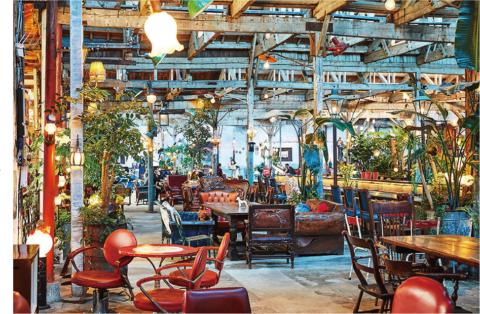 The café serves all kinds of coffee and other beverages, and is decorated both indoors and outdoors with antiques. You can even see the large concrete structures that were used for the weaving machines in the 1960s.