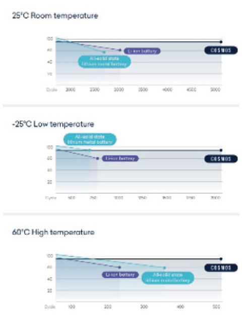 On the other hand, COSMOS LAB has successfully commercialized a product that can replace existing lithium-ion batteries by using water as an electrolyte and possessing the advantage of 100% non-ignition, and can thus deliver high performance at low temperatures (below -20˚C) and high temperatures.