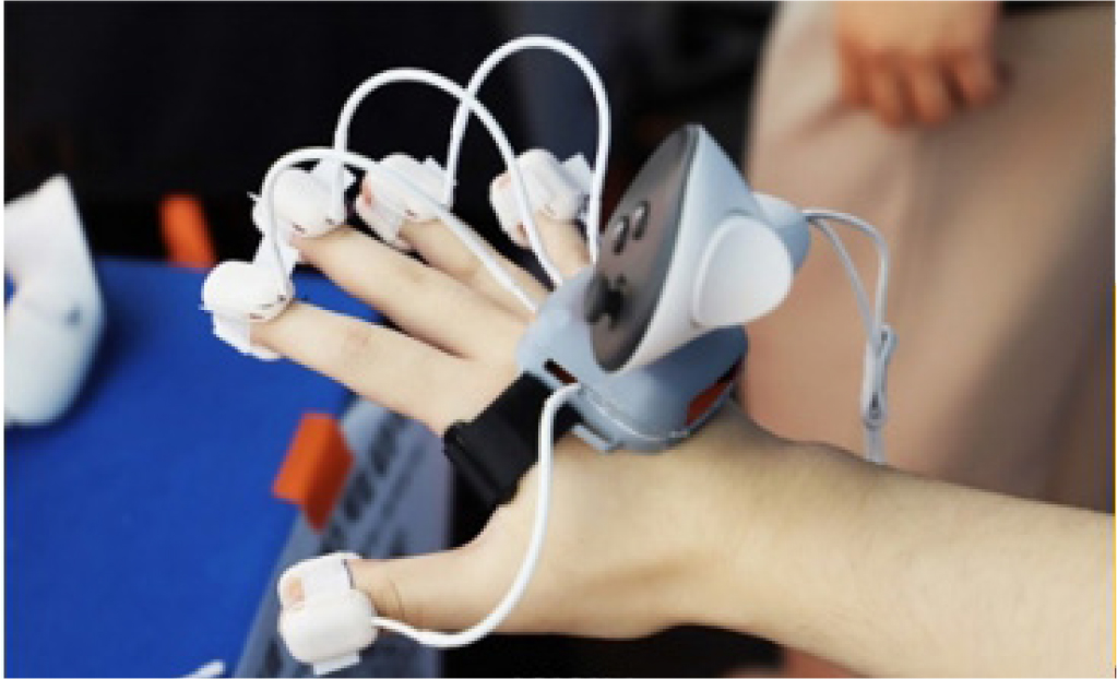 This product can naturally replicate sophisticated hand movements of users in virtual reality that were difficult to perform with existing VR controllers. It detects hand movements through a 3-axis accelerometer, 3-axis gyro, and 3-axis geomagnetic sensor.