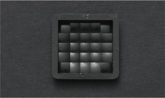 Used mainly for NIR and time-of-flight (ToF) sensors, NF26-25 NIR Fresnel lenses permit easy control for detecting direction, and detectable distance and angle. They are therefore applicable for various areas. Made of Poly NIR 212 material, they ensure high detection efficiency. Designed to effectively cut off the unnecessary visible rays, they accurately detect NIR signals. In the NIR areas (with an ordinary wavelength of 905nm), they guarantee high transmittance rate (up to 90%).