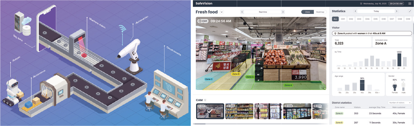 Complementing this, SafeVision intelligently analyzes unstructured in-store CCTV data, delivering valuable business intelligence through precise people counting, age/gender identification, and heatmap analysis for customer movement. It also includes features for automated employee management and proactive out-of-stock detection, optimizing retail operations and enhancing customer experience.
