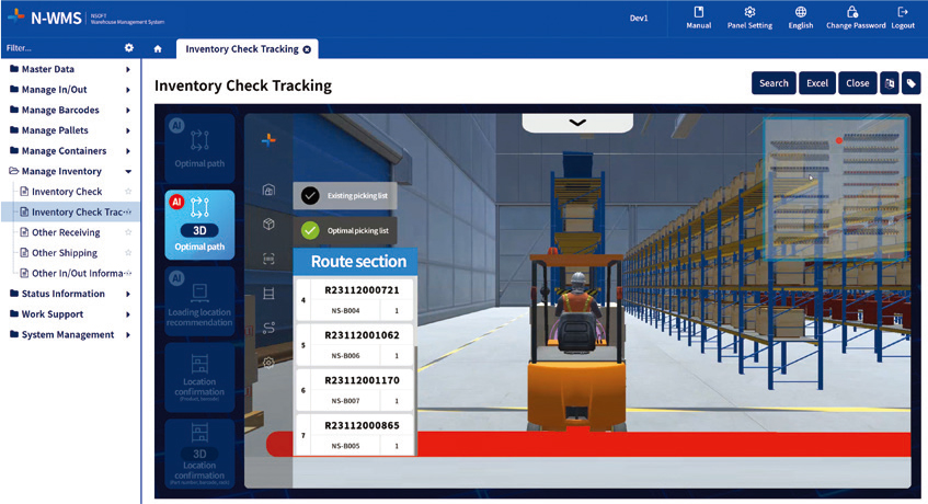 N–WMS is an AI-powered warehouse management system (WMS) that combines intelligent automation with robust core capabilities. Alongside essential WMS functions such as real-time inventory tracking, order fulfillment, barcode-based logistics, and inbound/outbound process control, N–WMS integrates six cutting-edge AI features—including path optimization, voice control, predictive analytics, and chatbot-based UI.