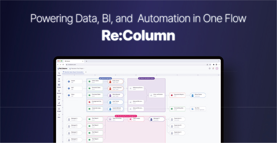 Re:Column is an integrated platform that simplifies and automates corporate data and document workflow. It automatically organizes unstructured and semi-structured data into structured databases, enabling instant generation of Excel, PDF, and customized reports.