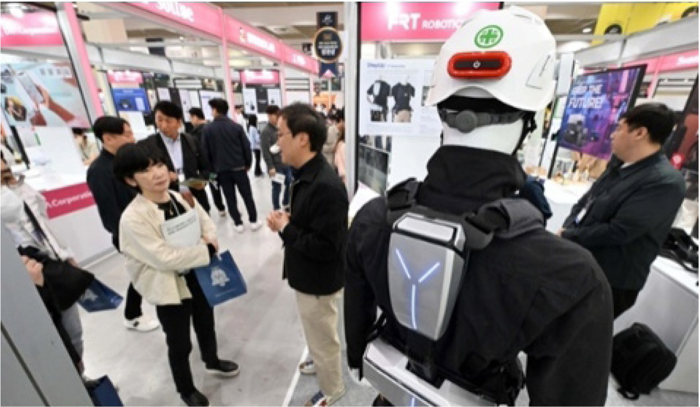 Step-Up, a wearable robot introduced by FRT Robotics, is aimed at assisting workers who have to move heavy objects in factories. It is a robot that can prevent musculoskeletal diseases by assisting muscle strength. Wearing it on the waist can reduce muscle fatigue by about 40%. Visitors to the exhibition booth showed great interest in preventing worker injuries and improving safety.