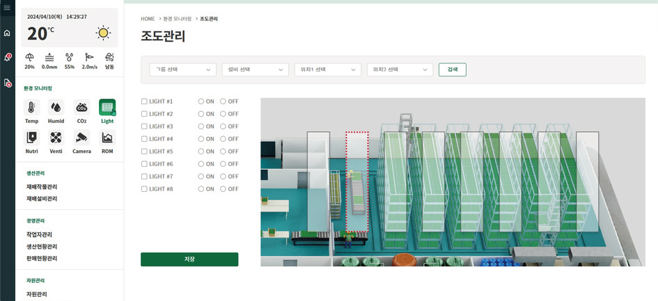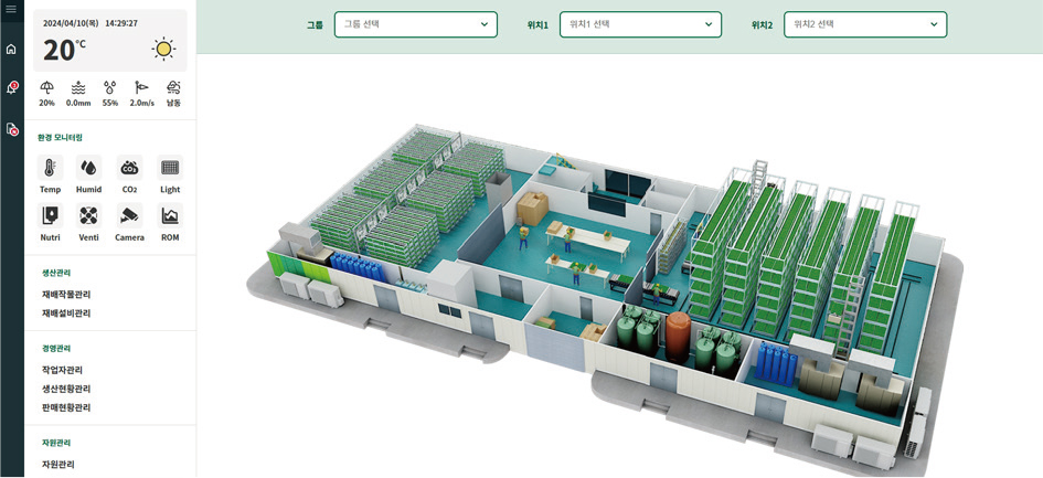 BrightFarm can manage and check the data (temperature, humidity, illumination, CO2, nutrient solution, ventilation/air conditioning, growth status, CCTV) of farms linked based on the same 3D model as the actual farm.