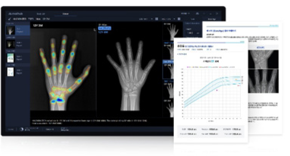 Firstly, mai:BoneAge, a bone age prediction AI fully integrated into the maiLink platform following its acquisition. Based on wrist X-ray images, it applies the Greulich-Pyle (GP) model to provide three priorities of bone ages, and provides the ‘My Child’s AI Growth Report,’ which visualizes predicted height and growth information. Cumulative reports by examination point allow for intuitive monitoring of growth changes and management points, supporting decision-making by medical staff and guardians.