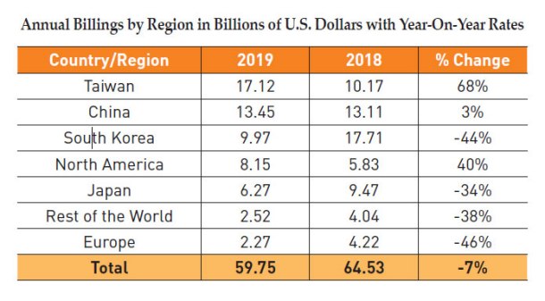 dislodging Korea from the top spot. China maintained its position as the second largest equipment market with sales of $13.45 billion, followed by Korea, at $9.97 billion, after receipts fell by 44 percent. While the new equipment markets contracted in Japan, Europe, and Rest of the World, North America equipment sales jumped 40 percent to $8.15 billion in 2019, the region’s third consecutive annual increase.