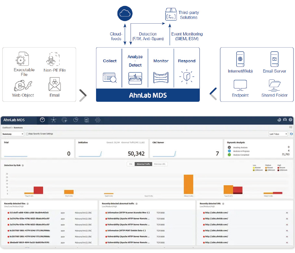 AhnLab’s MDS is an advanced sandbox-based solution designed to detect unknown threats and targeted attacks such as APTs and ransomware. Powered by AhnLab’s proprietary multi-engine, combining signature, reputation, machine learning, and behavior analysis, it delivers precise detection across networks, email, and endpoints. Its lightweight agent stops suspicious files in real time and isolates infected systems before damage occurs.