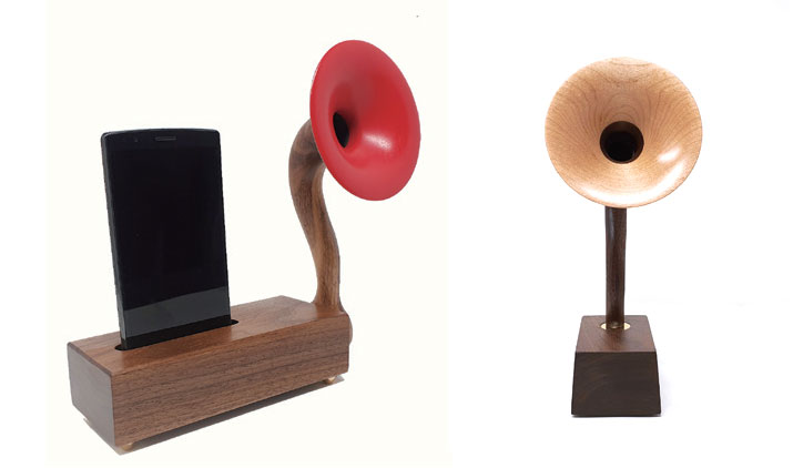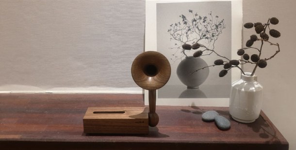 Ollim Speaker of STUDIO OLL, which is a smartphone cradle and a no-power wood speaker as well, made by using the principle of the sound chamber of the traditional woodwind instrument.
