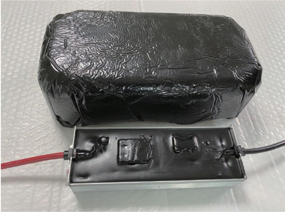 KM-660, a molding agent developed by Ilsin Cloud, has a high softening point that withstands high heat and heat dissipation, while maintaining a low viscosity to facilitate permeability. It protects electronic parts with waterproofing, dust-proofing and moisture-proofing, and it is a flame-retardant material, so it does not burn.