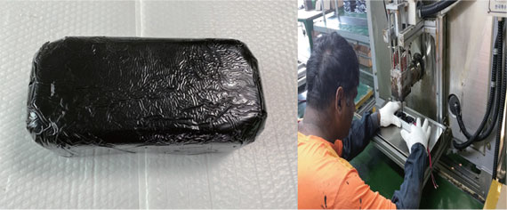 KM-660, a molding agent developed by Ilsin Cloud, has a high softening point that withstands high heat and heat dissipation, while maintaining a low viscosity to facilitate permeability. It protects electronic parts with waterproofing, dust-proofing and moisture-proofing, and it is a flame-retardant material, so it does not burn.