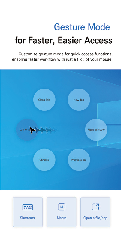 In addition to the existing key mapping and macro system, the user can maximize work efficiency with a sensory interface by combining clicks and directions through the ‘gesture’ function.