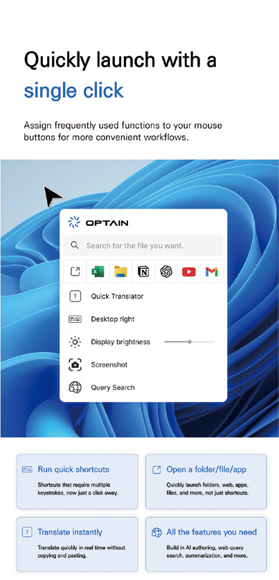 Optain is mouse-customizing SW equipped with a user-customized pop-up system, a solution that helps perform digital work more intuitively and flexibly.
