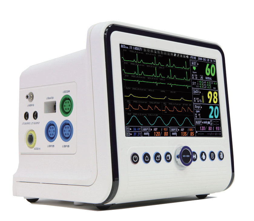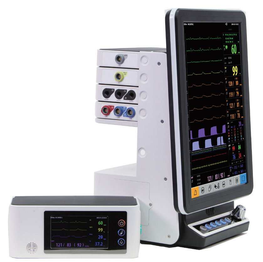 Patient Monitor obtains the physiological signals such as ECG, respiratory rate, NIBP, SpO2, temperature, and other optional parameters. There are various sizes of display (15, 12, 8, 4 inches) with color TFT touch screen. It can check multiple monitors through the central monitoring system. It provides multiple placement modes with its smart hook & stand design. It works over 5 hours on battery.