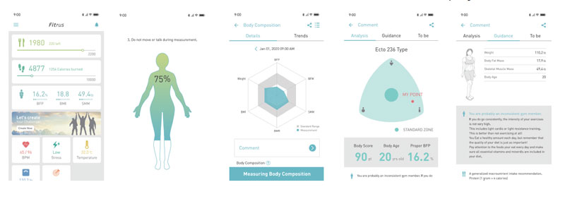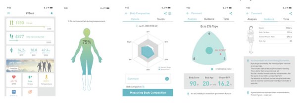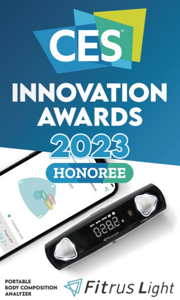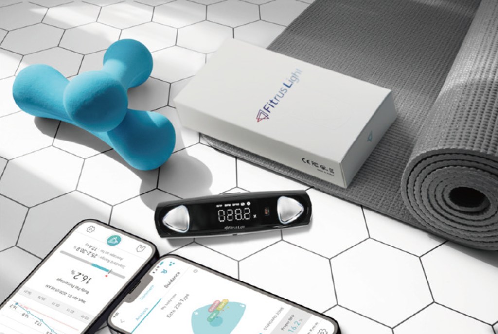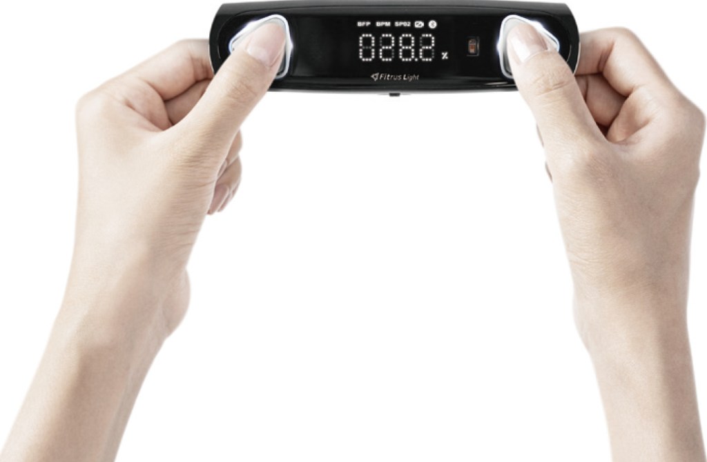 Fitrus Light is a portable body-composition analyzer that can measure bodycomposition with only a fi nger through four contact electrodes using bioelectrical impedance analysis (BIA). This product is a home self-health management healthcare device that presents the measurement results directly through an LED display and can measure various kinds of health information such as body fat percentage, body fat mass, skeletal muscle mass, basal metabolic rate, BMI, heart rate, and stress index.