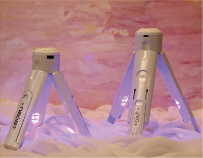 As the product is tripod-shaped, any types of objects placed within the range of the tripod can be sterilized. And, it is also possible to widen the sterilization scope by extending the legs of the tripod. Anyone can easily and simply use the sterilizer as it starts working and automatically stops three minutes after the sterilization. All that the user has to do is to place an object within the tripod and press the power button on top for sterilization. In addition, it can be used as a cradle and a camera tripod by attaching the head cap.