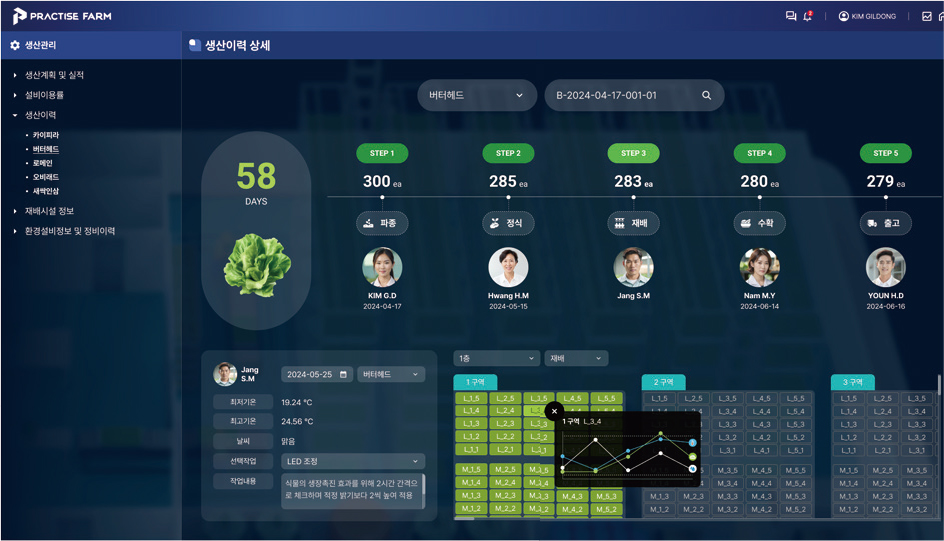 In addition, PRACTISE FARM manages the electric energy and water-capacity required for smart-farm operation, check the growth status of crops, check for any abnormalities in installed equipment, and check the cultivation facility and environmental facility information. It also checks usage status, utilization rate, and maintenance history, and thus carrying out efficient production planning and performance management.