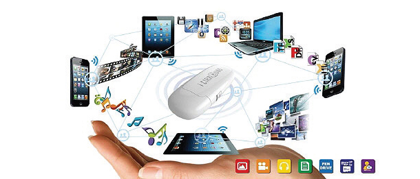 It can be used without the Bluetooth connectivity consuming much battery life and separate WiFi and it can share data with up to 10units of USB wirelessly. It is compatible with nearly all kinds of smart devices including iPads, iPhones, notebooks and electronic devices including PCs using USB, PCs, TVs, and SD cards, so that it can easily exchange data. And display of simultaneous images (up to five units) and streaming playback (sound files) are possible, respectively.